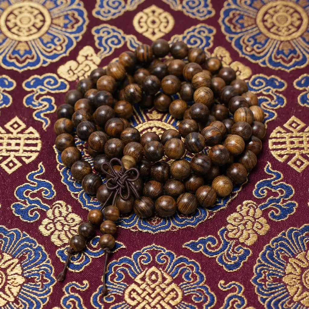 108 mala beads prayer bracelet in natural wood displayed on traditional Tibetan brocade fabric with gold and red Buddhist patterns