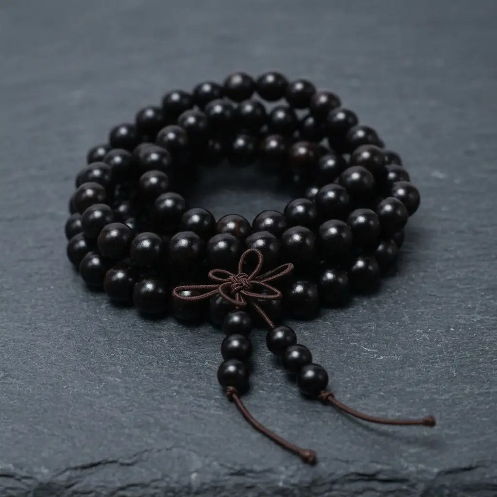 108 ebony wood mala beads bracelet in deep black with smooth polished beads and Tibetan knot tassel on dark slate stone background