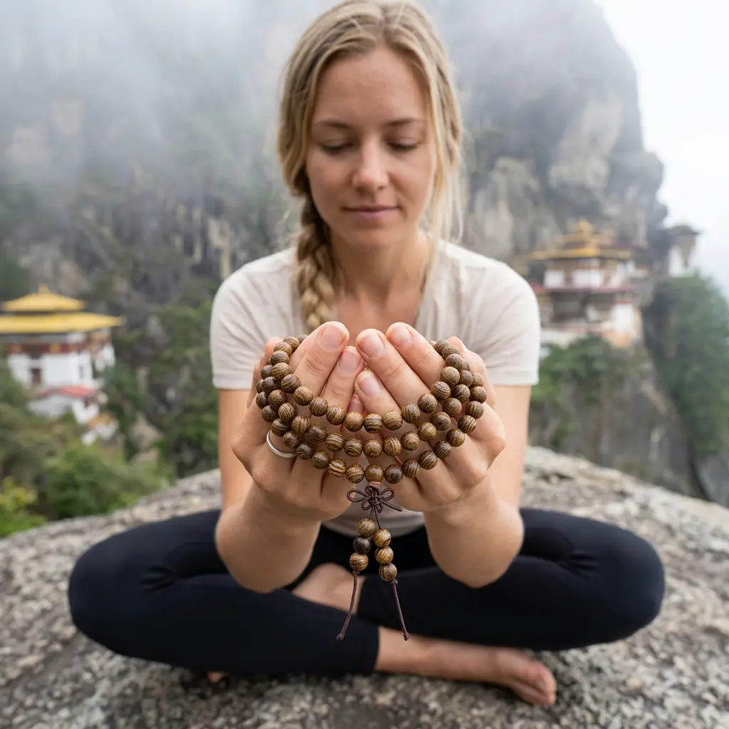 Woman meditating outdoors holding 108 wenge wood mala beads in cupped hands with misty Himalayan cliff and traditional Tibetan monastery visible in background