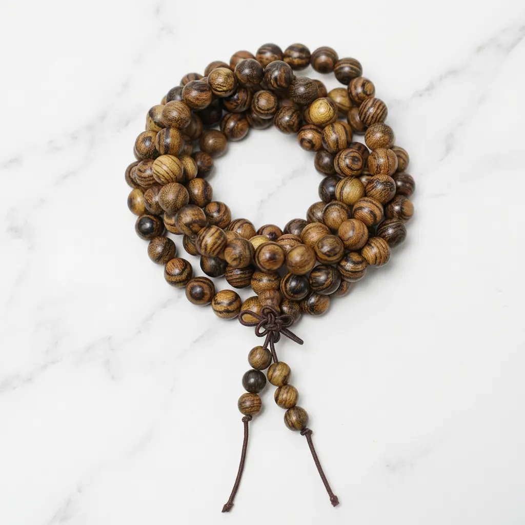 108 natural wood mala beads bracelet showing bold grain pattern wrapped as necklace with tassel on white marble background