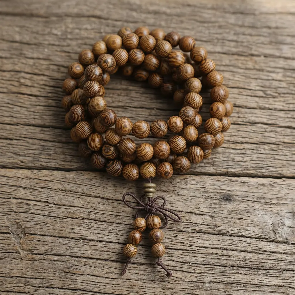 108 wenge wood mala beads bracelet with tiger-stripe grain pattern and traditional Chinese knot tassel on rustic wooden surface
