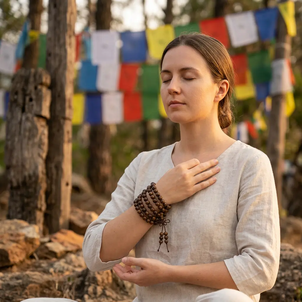 Woman in peaceful outdoor meditation wearing 108 wood mala beads as wrap bracelet on wrist with colorful Tibetan prayer flags in background