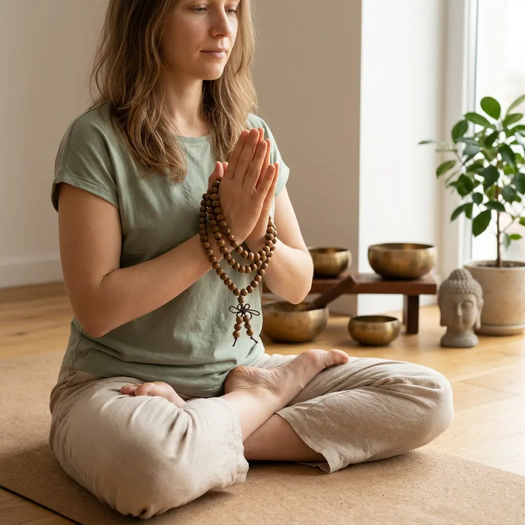 Woman sitting cross-legged indoors in Anjali mudra holding 108 wood mala beads beside Tibetan singing bowls and Buddha statue for meditation practice