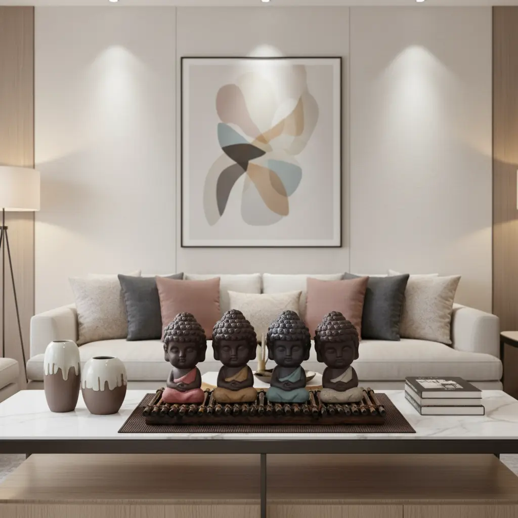 Four decorative Buddha figurines arranged on white marble coffee table in contemporary living room with abstract wall art and neutral toned sofa