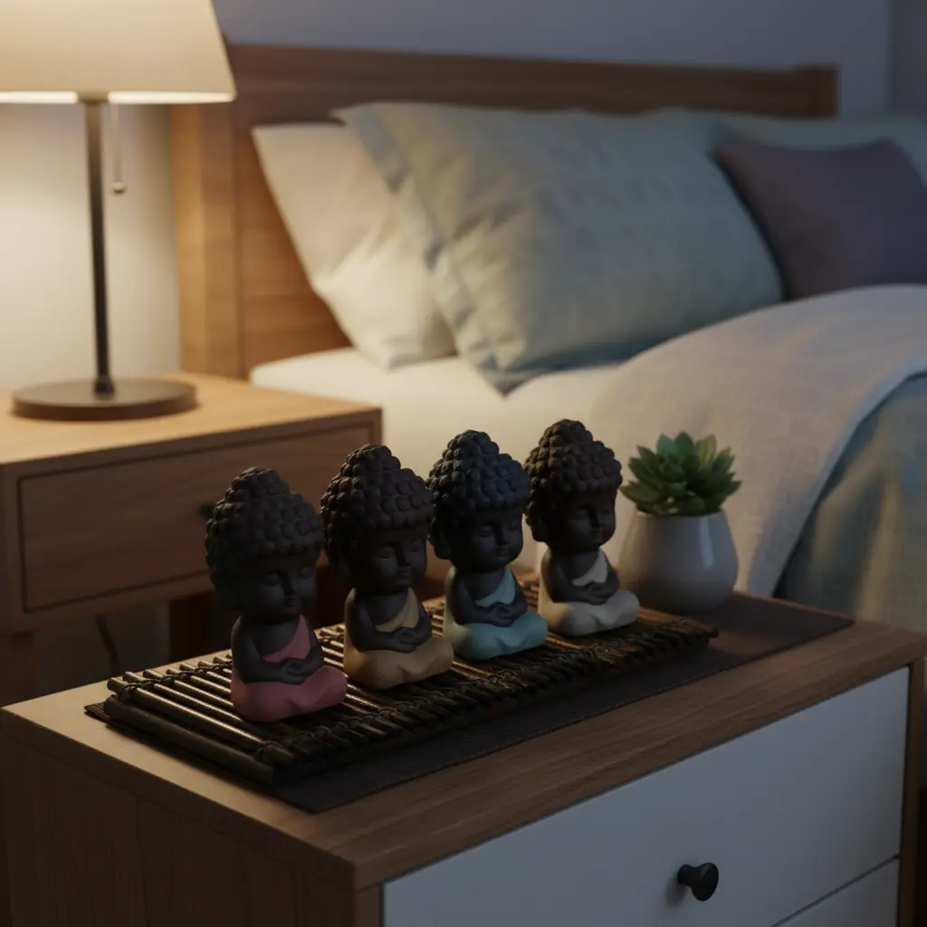Four small Buddha figurines arranged on wooden bedside table next to table lamp with cozy bed and pillows in soft evening lighting