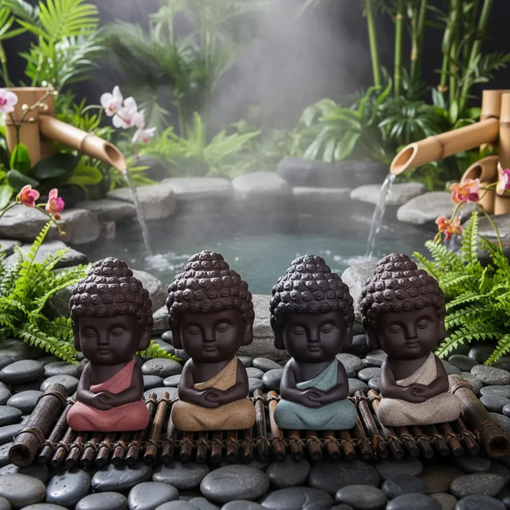 Four mini Buddha figurines on bamboo platform beside natural hot spring pool with bamboo water features, tropical plants and zen garden stones