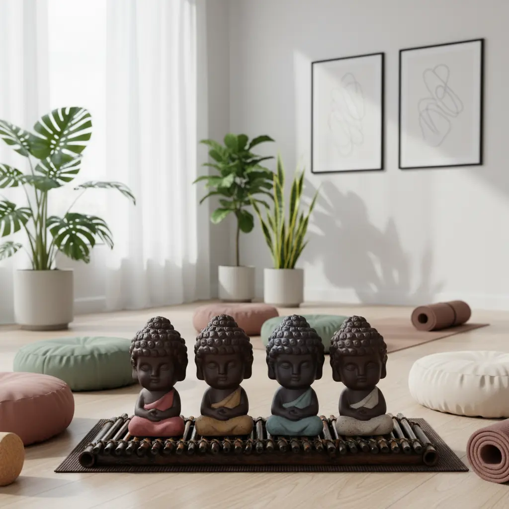 Four small Buddha figurines on bamboo mat in bright yoga studio with rolled yoga mats, meditation cushions in pink and green, and houseplants near white curtained windows