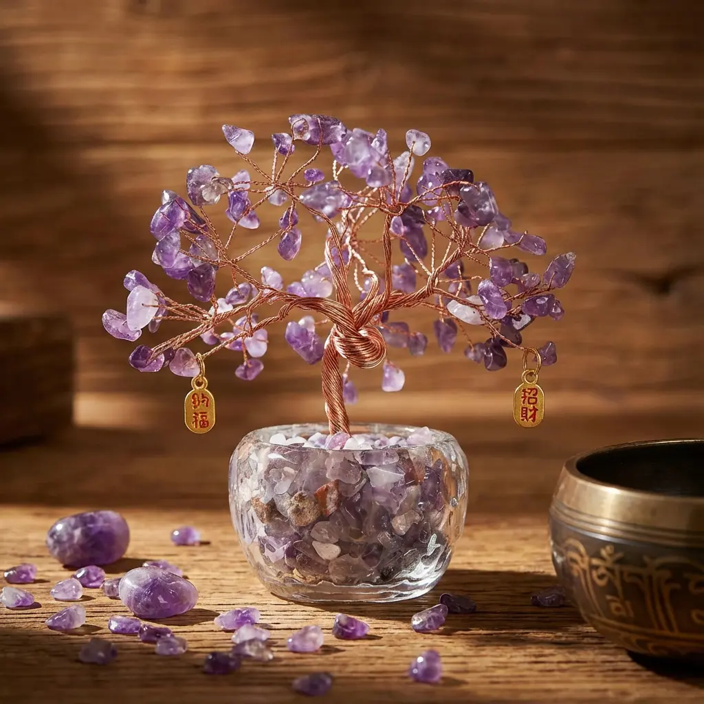 Amethyst feng shui tree wooden background crystals