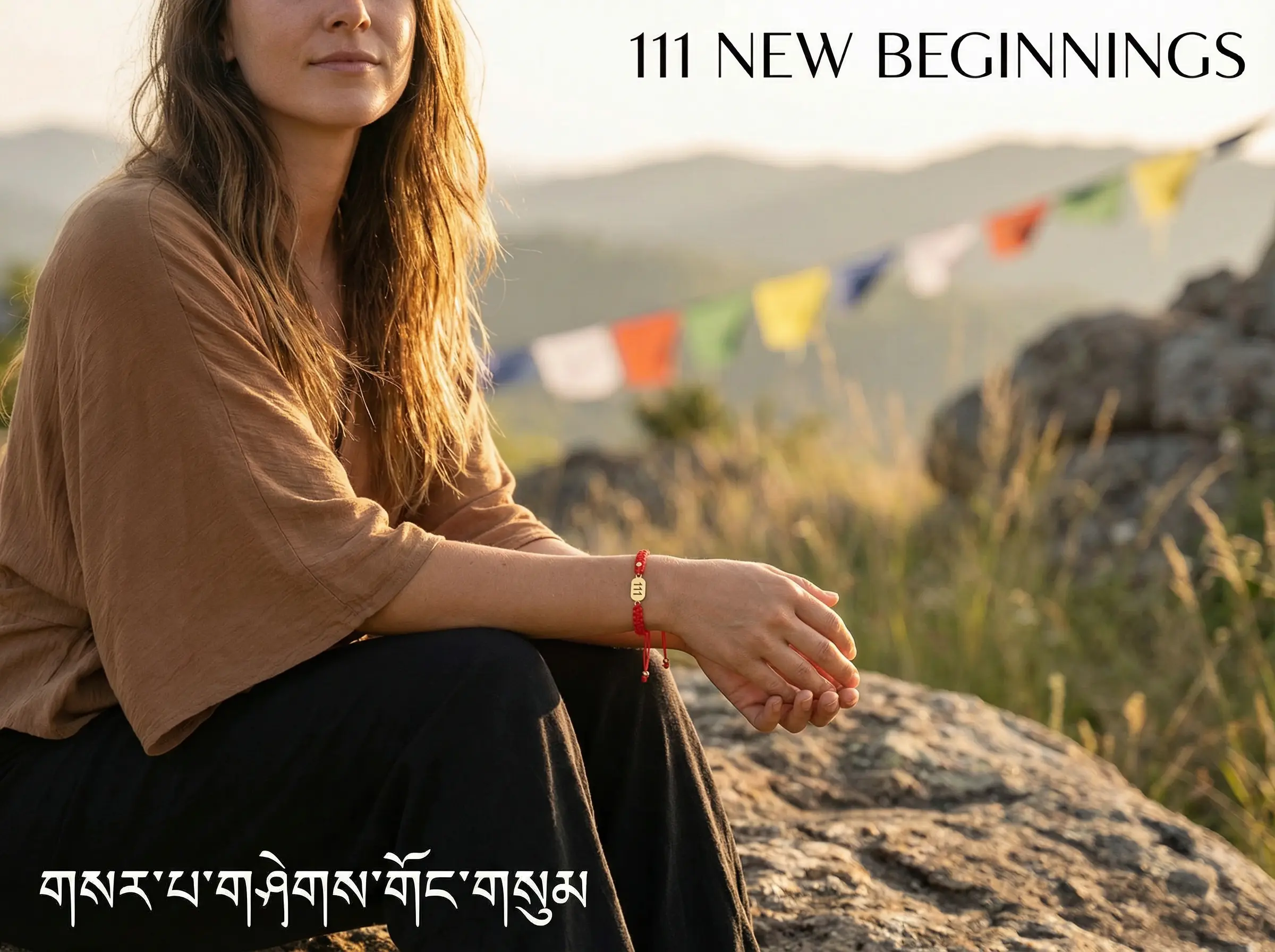 111 angel number bracelet new beginnings woman meditating outdoors with tibetan prayer flags