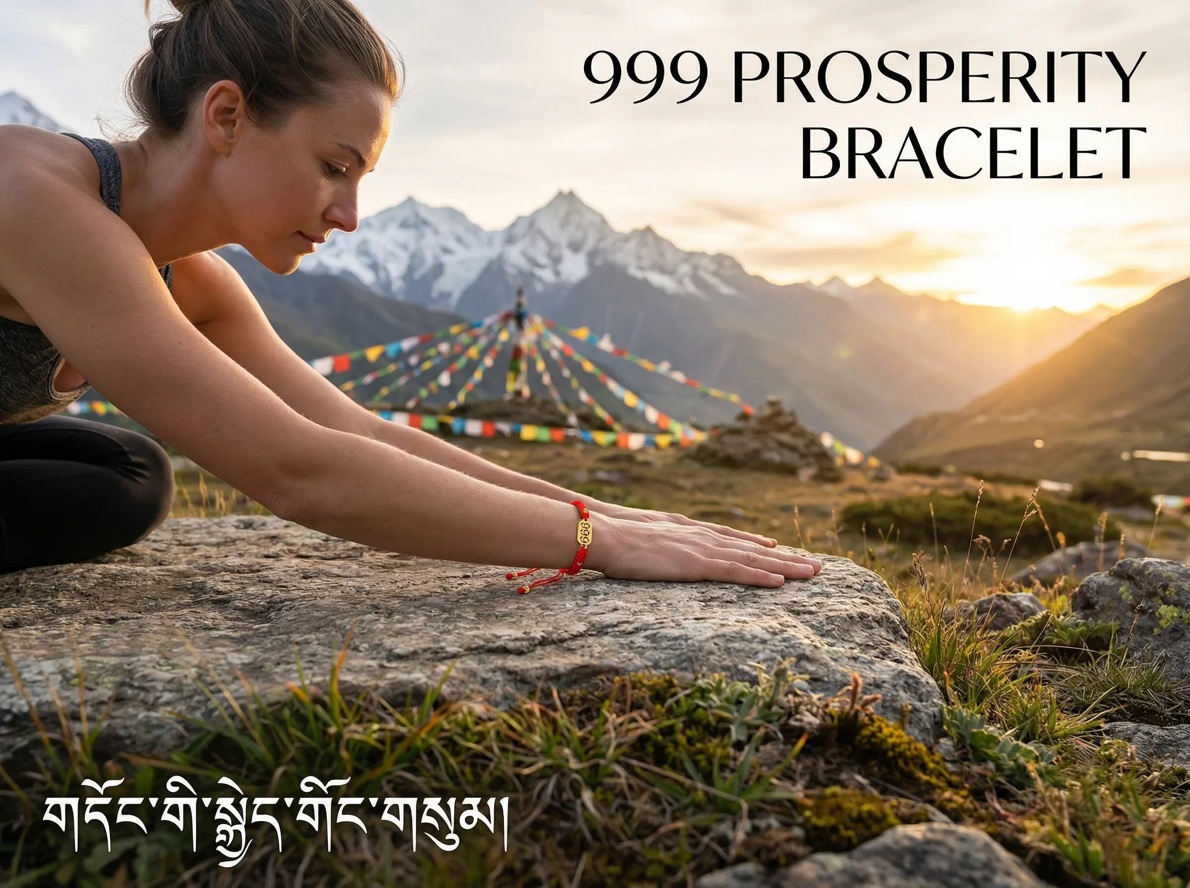 999 angel number bracelet prosperity woman practicing yoga in himalayan mountains with prayer flags