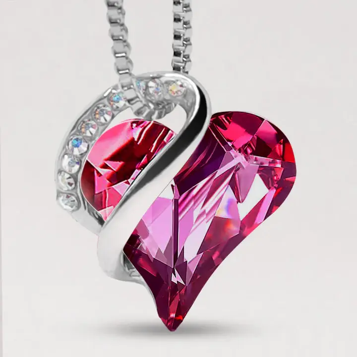 Heart-shaped rose red fuchsia birthstone crystal pendant necklace on stainless steel chain, love energy gift for wife girlfriend