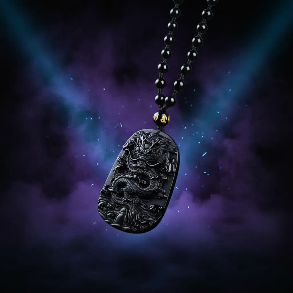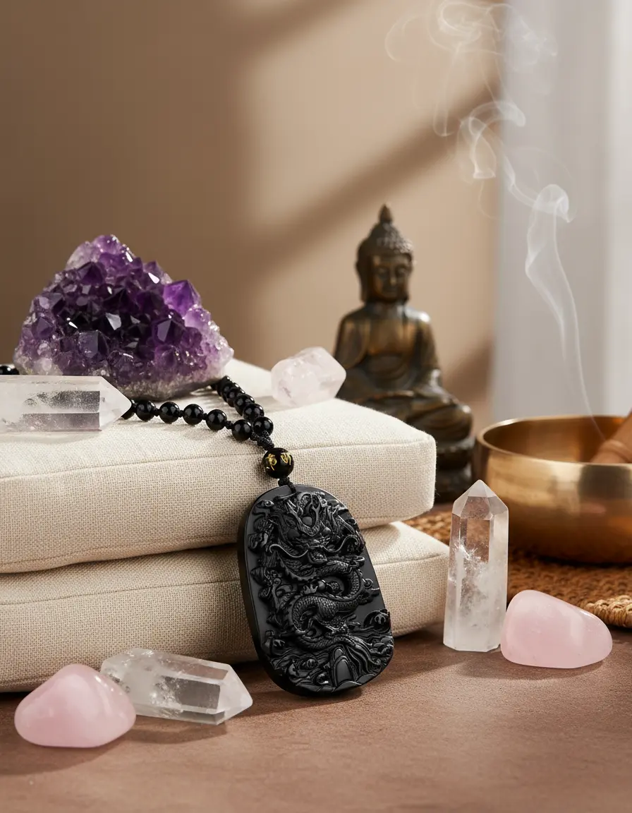 Obsidian dragon necklace spiritual meditation display
