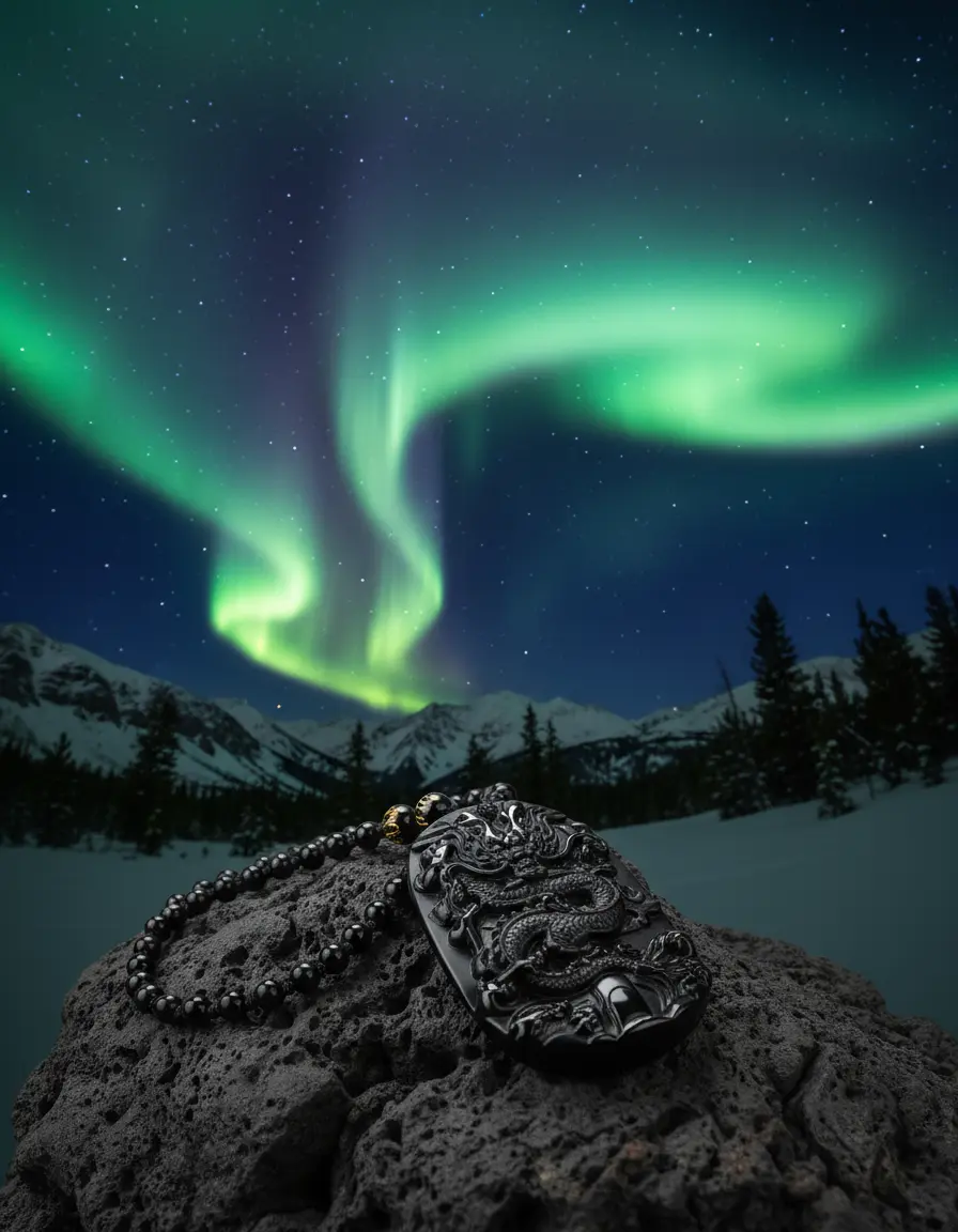 Obsidian dragon pendant under aurora borealis