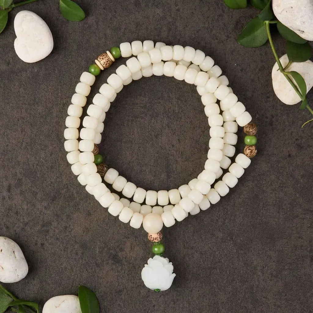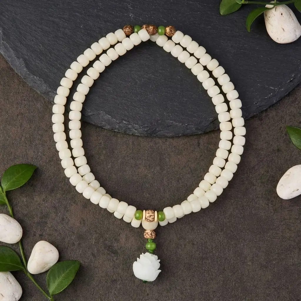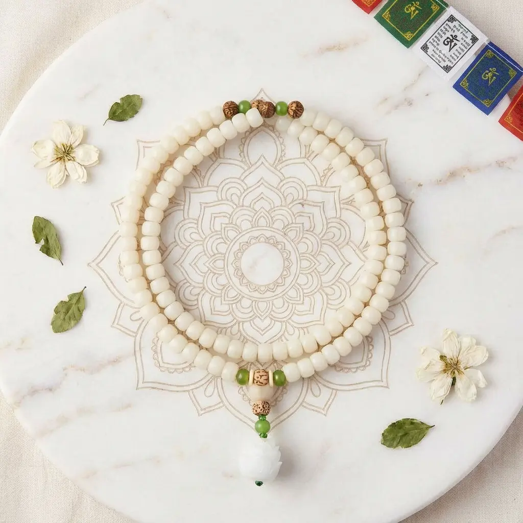White bodhi seed mala 108 beads with jade lotus pendant on mandala marble plate