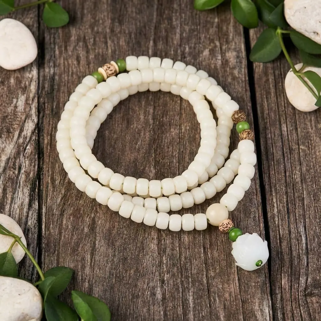 White bodhi seed mala bracelet with jade lotus on rustic wood background