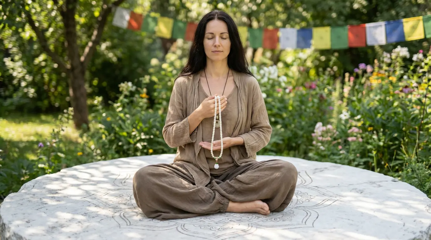 Woman meditating with white bodhi seed mala beads in garden setting