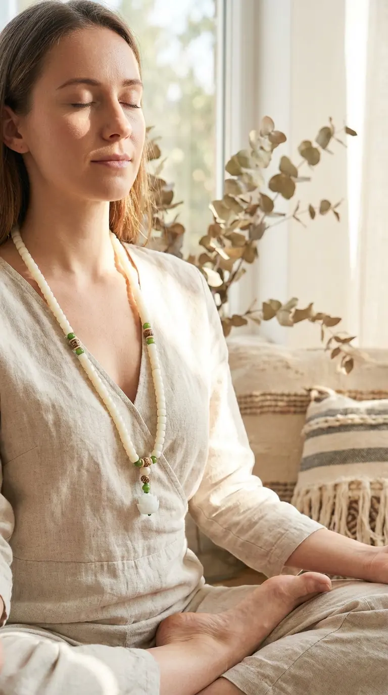 Woman wearing white bodhi seed mala necklace during meditation practice