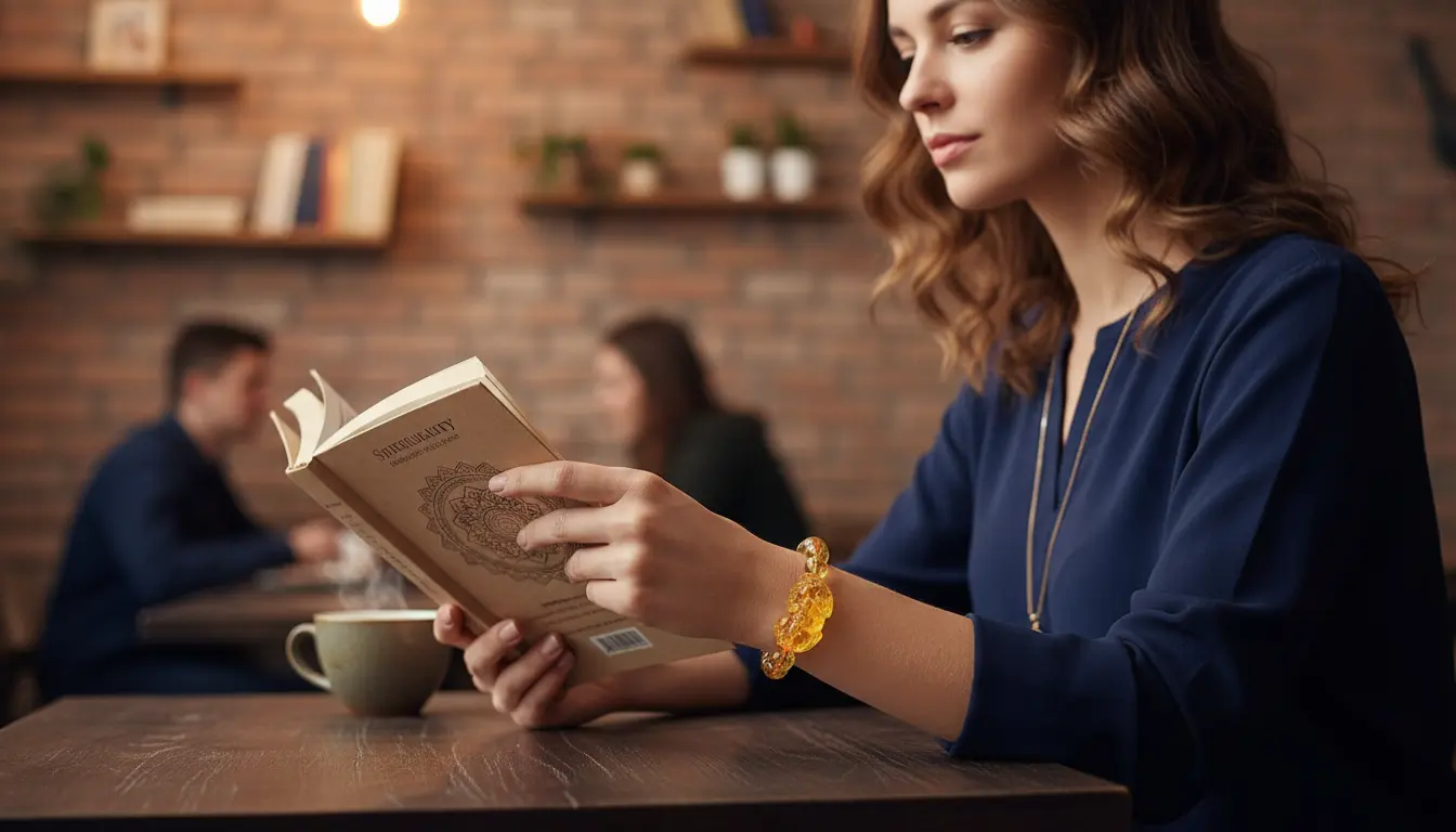 Woman wearing citrine pixiu bracelet reading in cafe