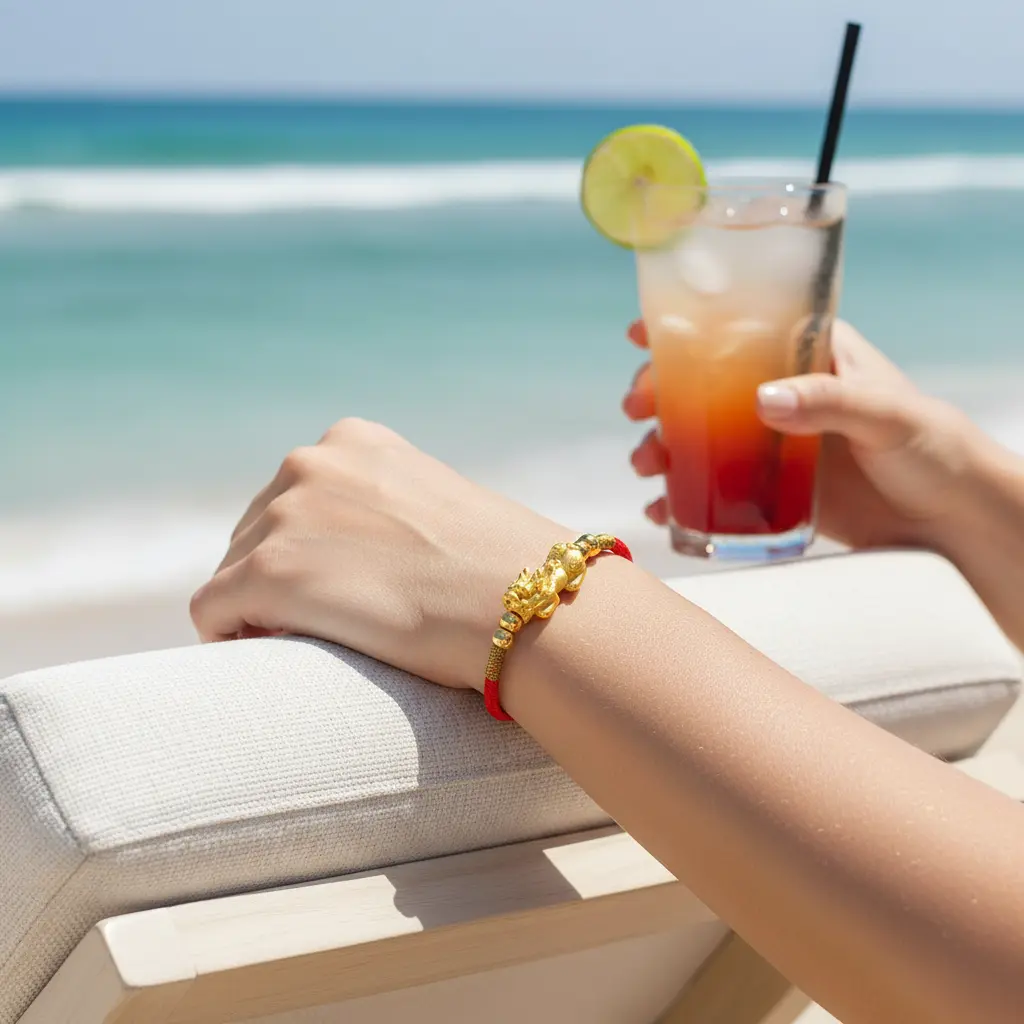 Gold pixiu lucky bracelet beach vacation lifestyle photo
