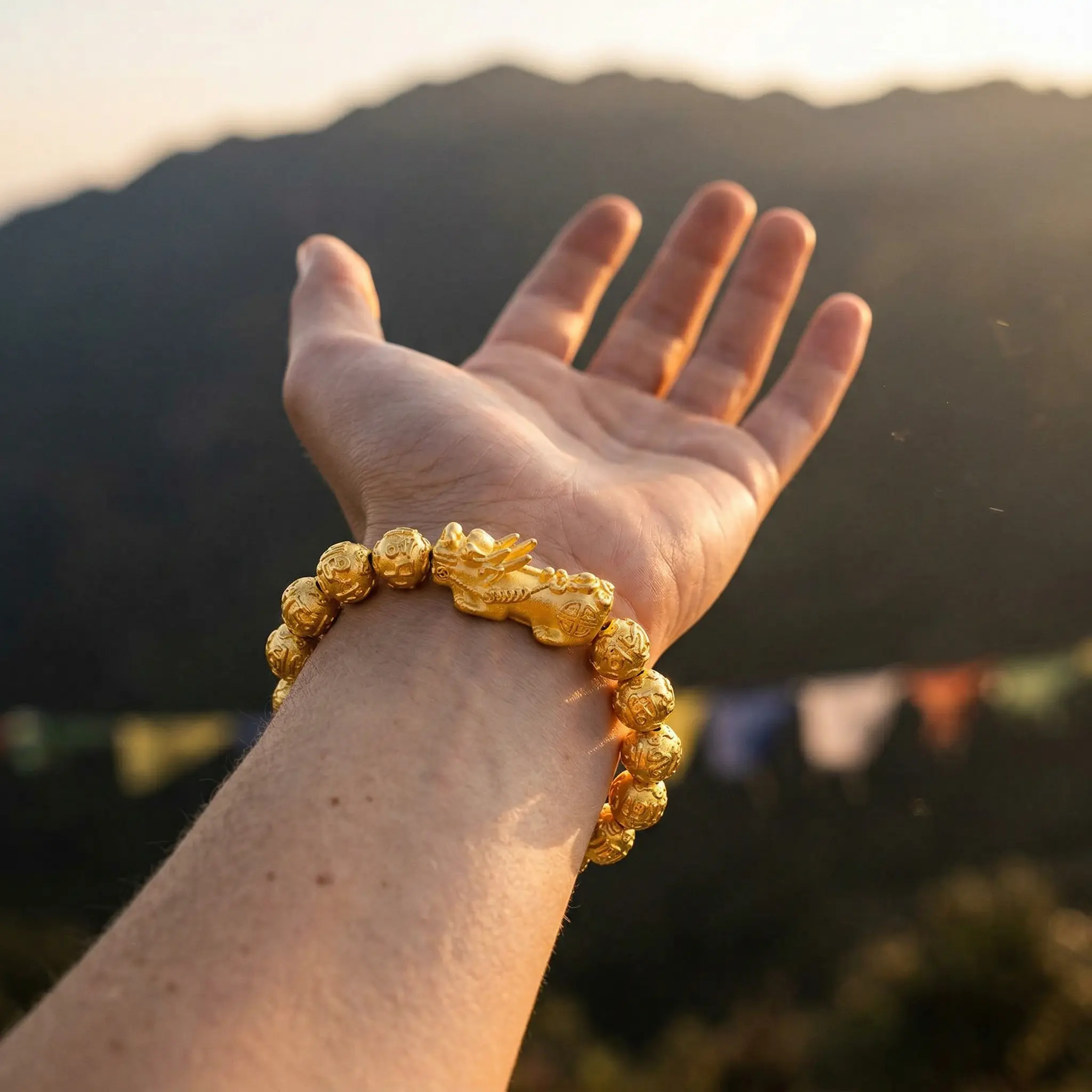 Hand raised outdoors wearing gold Pixiu wealth mantra bracelet at golden hour sunset, Himalayan mountains and Tibetan prayer flags in background
