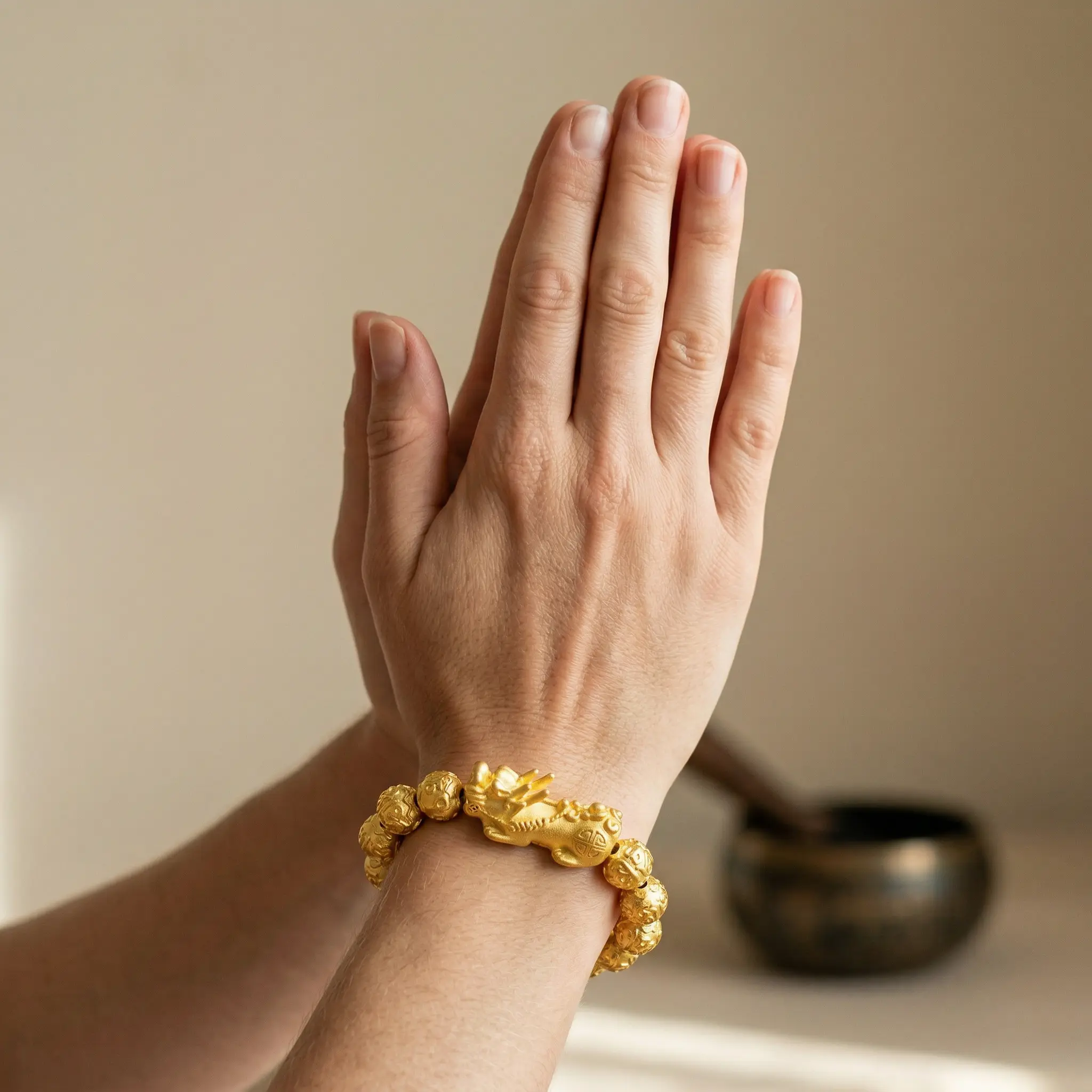 Hands in Namaste prayer position wearing gold Pixiu mantra bracelet on left wrist, Tibetan singing bowl in background, feng shui spiritual jewelry