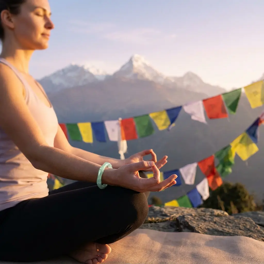 999 angel number bracelet prosperity woman practicing yoga in himalayan mountains with prayer flags