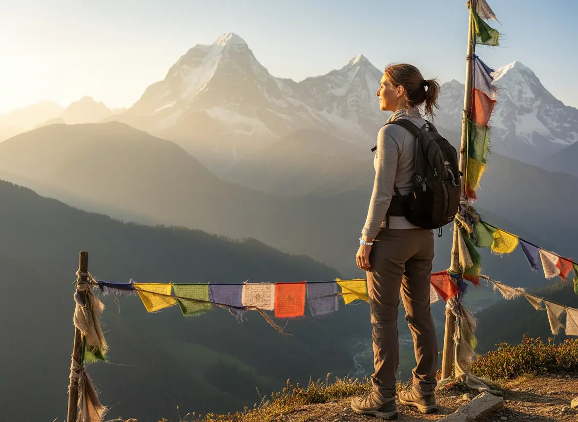 Close-up of hand wearing tiger eye bracelet with prayer flags at sunset on plateau