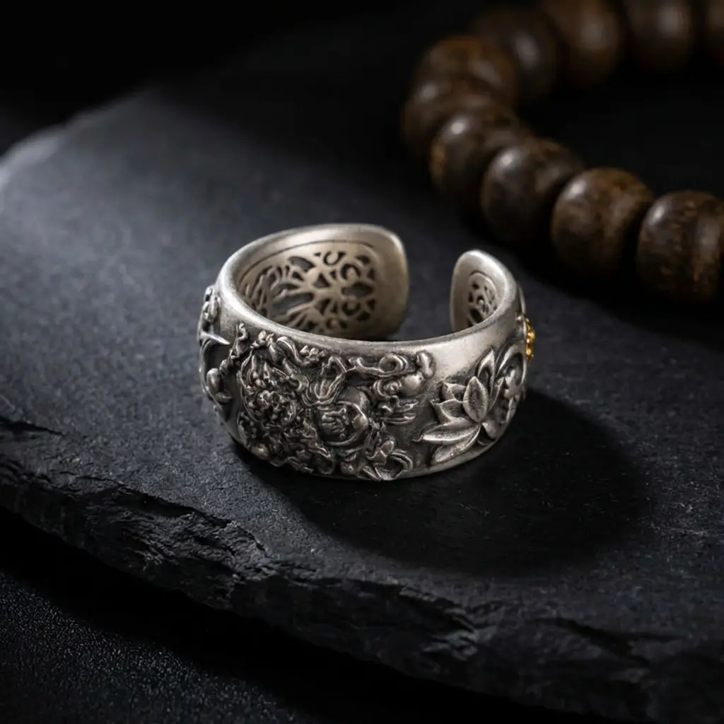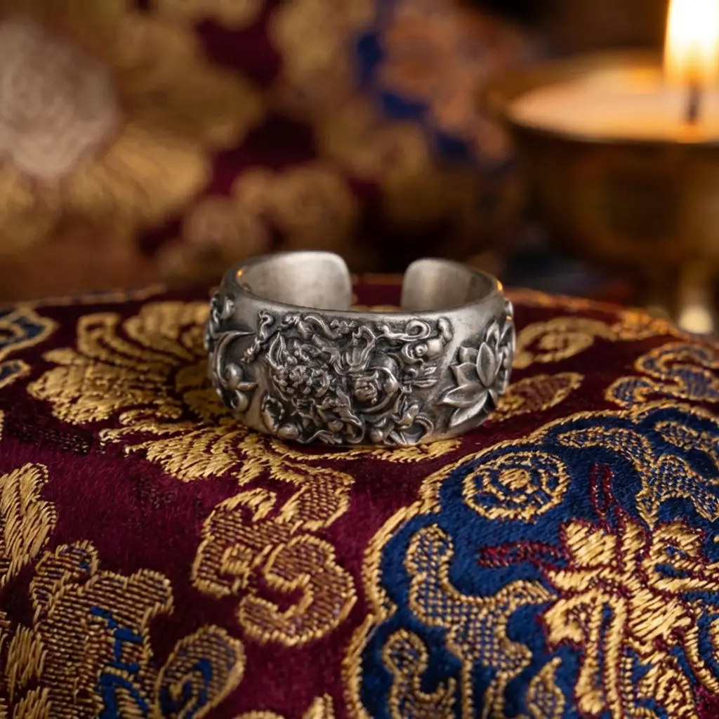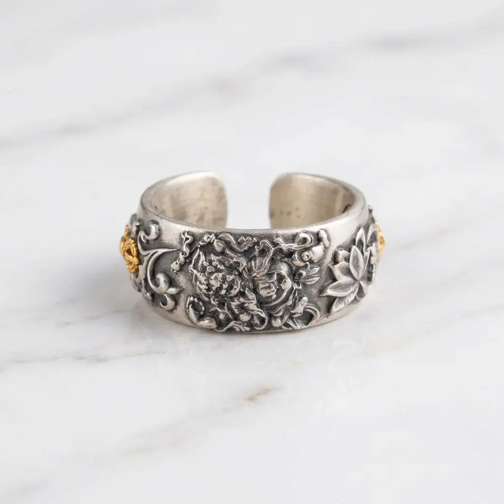 The 10mm wide band features deeply carved lotus blooms, gold-tone vajra accents, and an intricate filigree inner pattern. The adjustable open-back design fits most finger sizes comfortably, so you never need to worry about sizing.