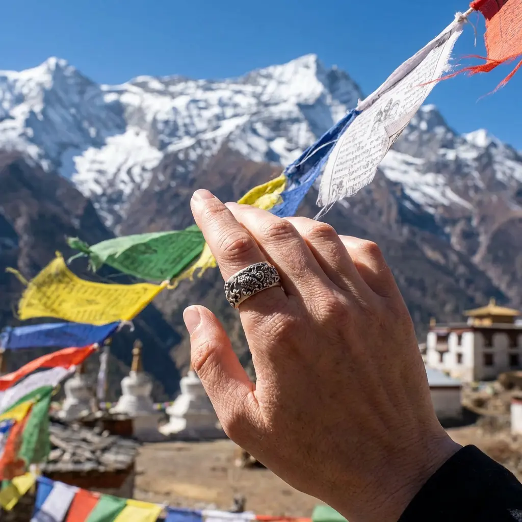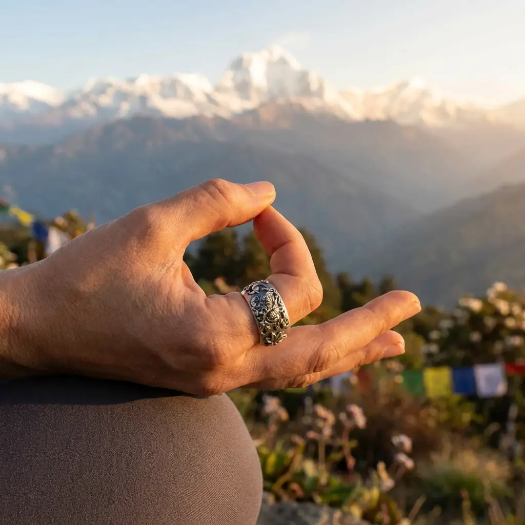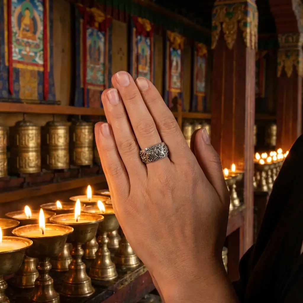 Forged in S925 sterling silver by skilled Tibetan artisans, this ring carries the fierce, protective energy of Mahakala — Buddhism’s most powerful guardian deity. Every curve on the band tells a story of spiritual strength, compassion, and centuries-old sacred tradition. Wear it daily as your personal armor against obstacles, fear, and negativity.