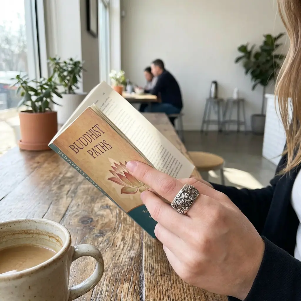 🔗 Filigree Inner Band — Your Secret Sacred Detail Turn the ring over and you’ll find delicate filigree lacework engraved on the inner band — visible only to you. This mirrors a core Buddhist teaching: true spiritual practice lives inside, not on display. It’s a quiet, intimate reminder of your inner depth.
