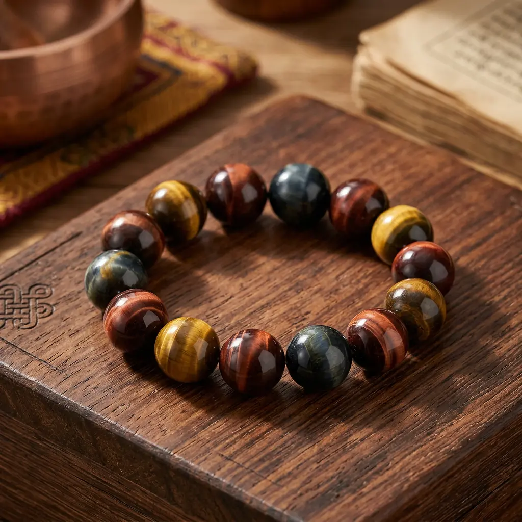 Multi-color tiger's eye protection bracelet with yellow, red and blue Hawk's Eye 10mm beads, displayed on a carved Tibetan wooden block beside a singing bowl and ancient scripture