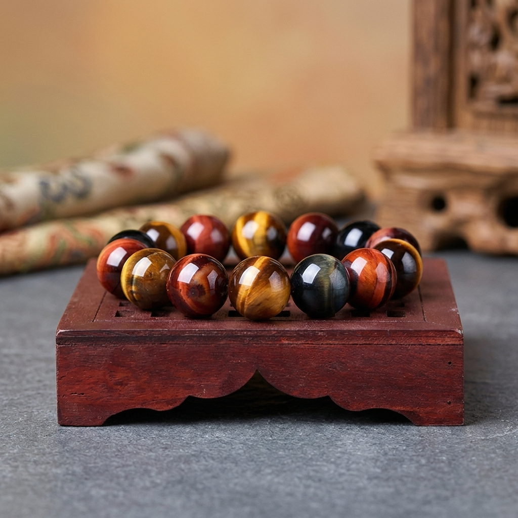 Genuine 10mm tri-color tiger's eye bracelet featuring golden, red and blue beads, resting on a traditional Tibetan rosewood stand with prayer scroll and carved wood in the background