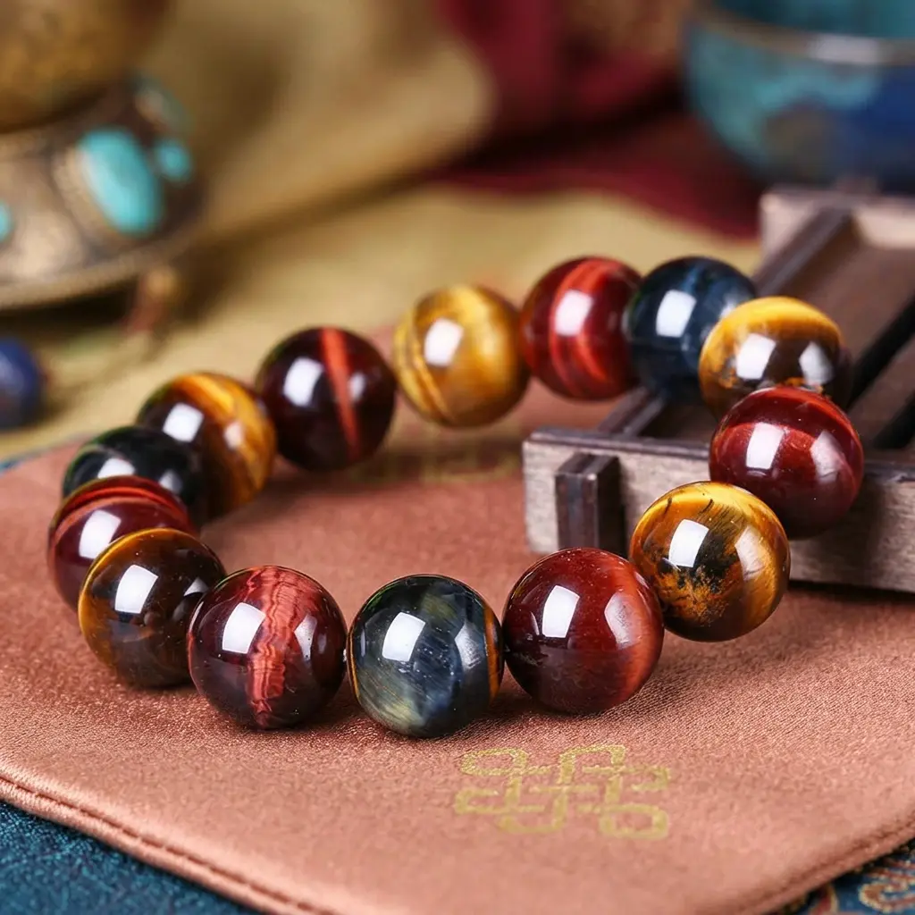 AAA grade multi-color tiger's eye protection bracelet with bold 10mm round beads in golden yellow, deep red and blue Hawk's Eye, placed on a Tibetan silk brocade tray with Dzi bead and wooden stand
