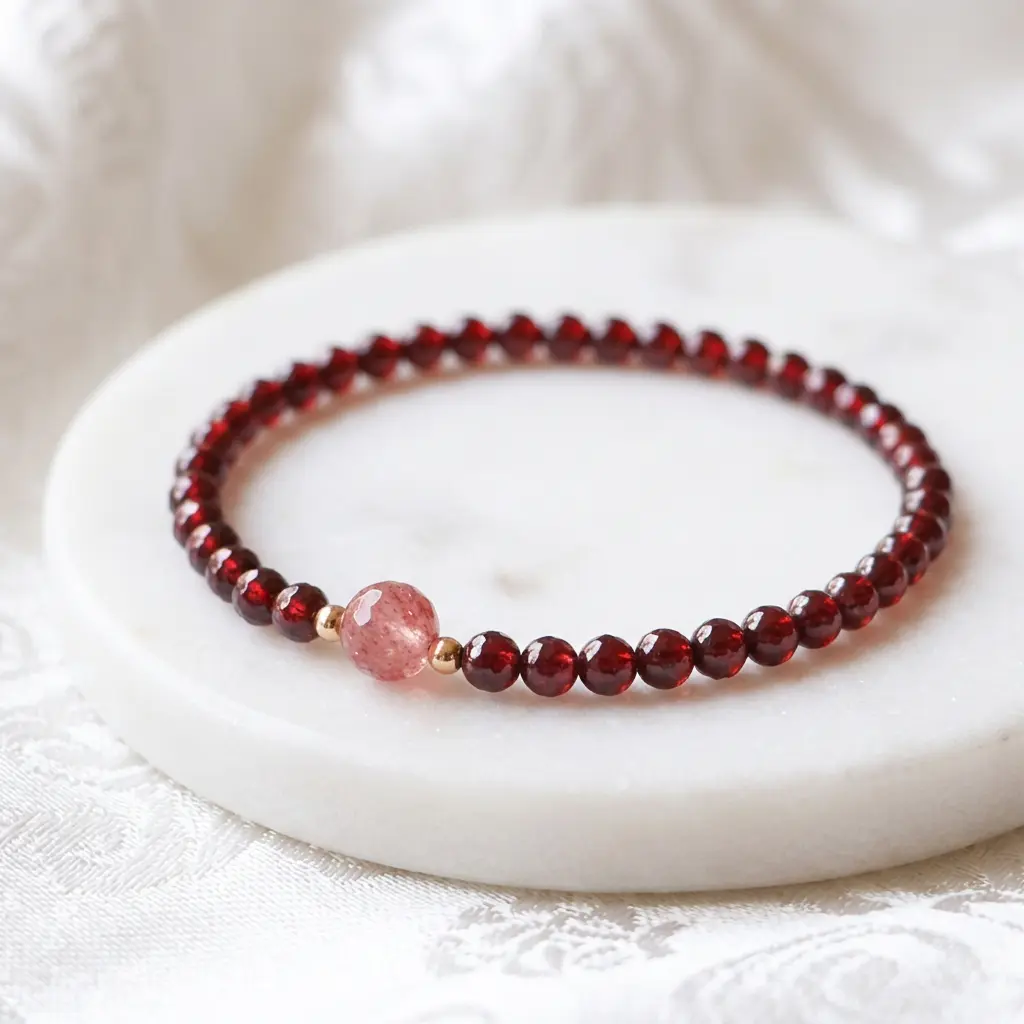 Close-up of 4mm faceted natural garnet bracelet with strawberry quartz and gold spacer beads displayed on white marble dish