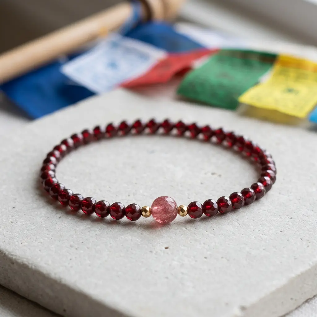 4mm natural garnet and strawberry quartz healing bracelet with gold spacers displayed on stone surface with colorful Tibetan prayer flags in background