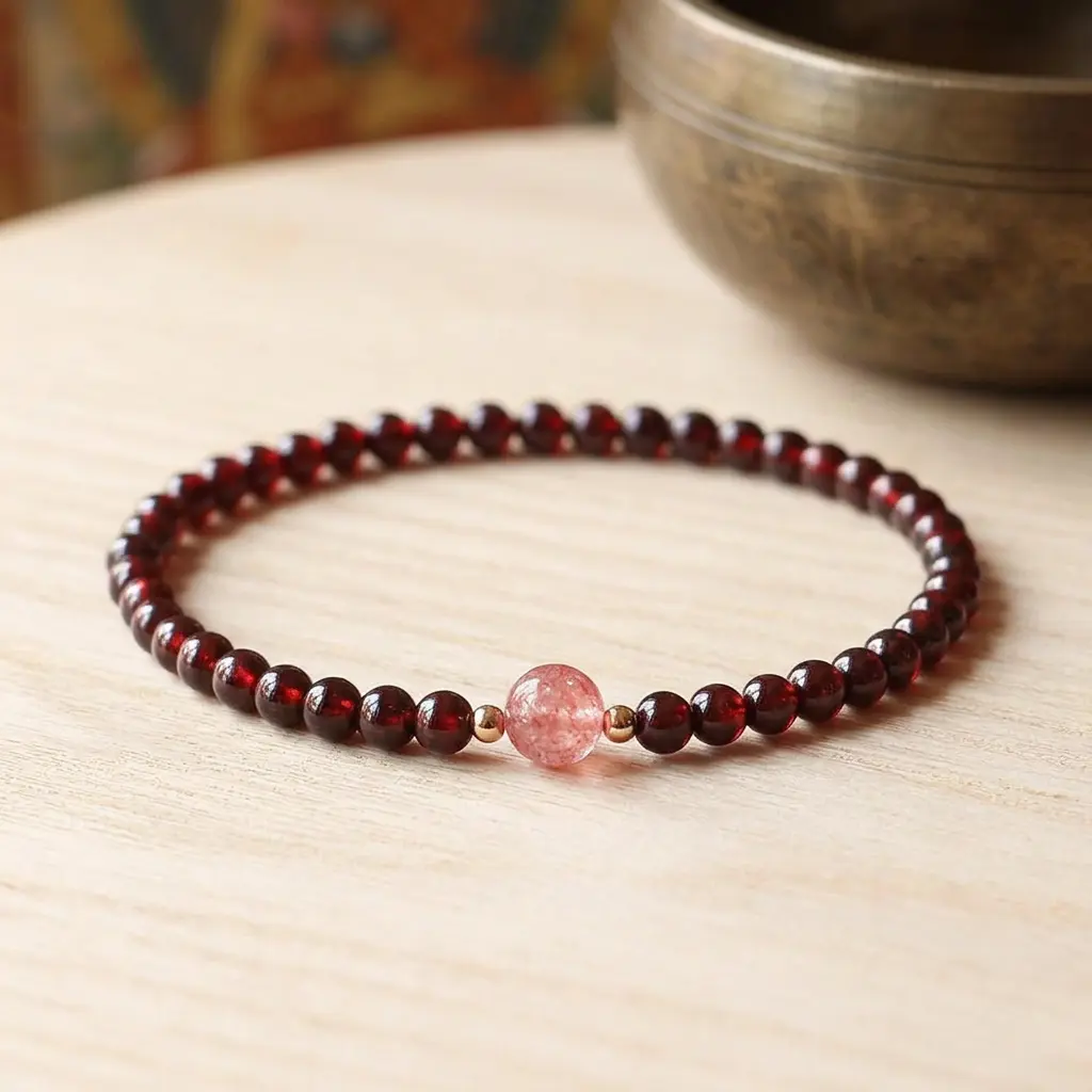 Natural red garnet beaded bracelet with pink strawberry quartz center bead and gold-filled spacers on wooden surface beside a Tibetan singing bowl
