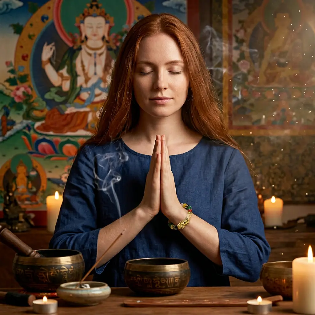 Woman wearing Pixiu five elements agate bracelet on left wrist while meditating with Tibetan singing bowls, incense, and thangka painting in background