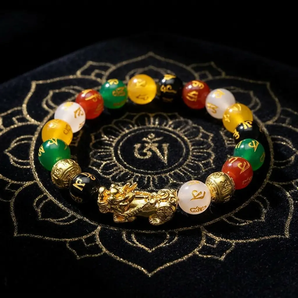 Pixiu five elements natural agate bracelet with gold-plated charm on black velvet Tibetan Om mandala embroidery background