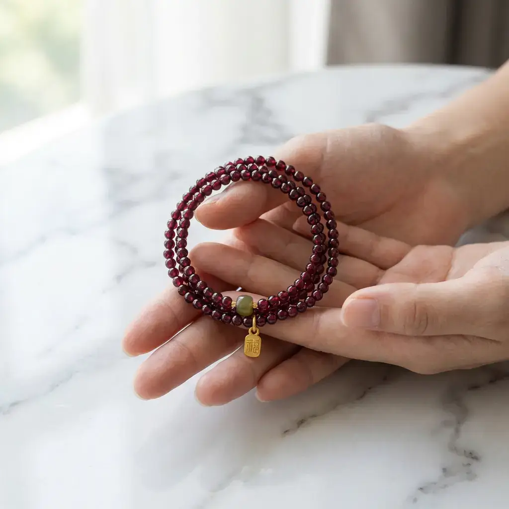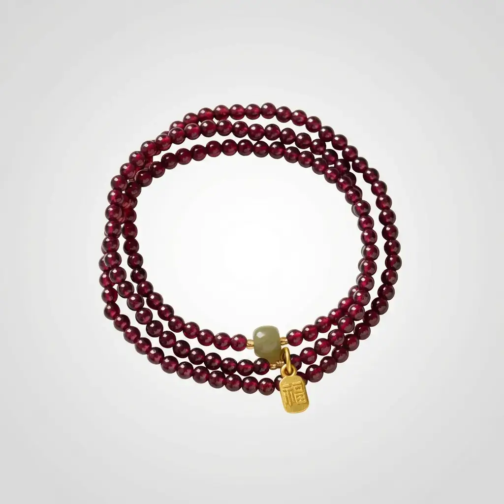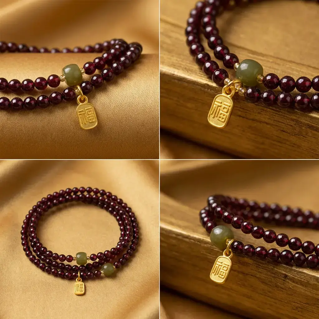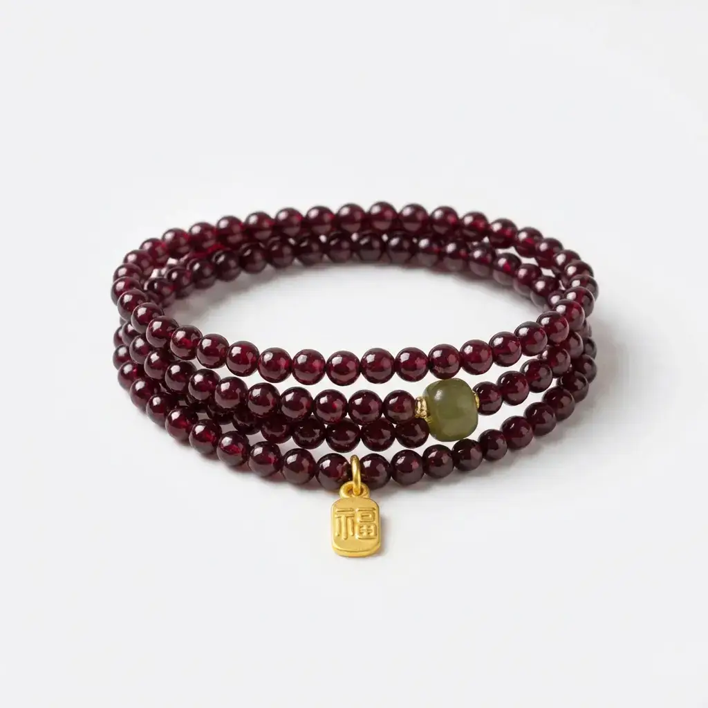 The deep red stones catch the light beautifully. The golden Fu charm adds a touch of elegance. Together, they create a piece you’ll love to wear.