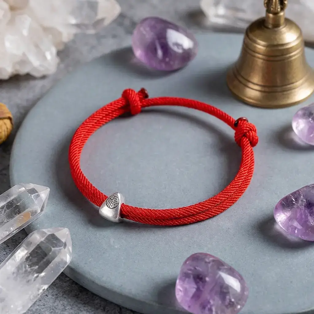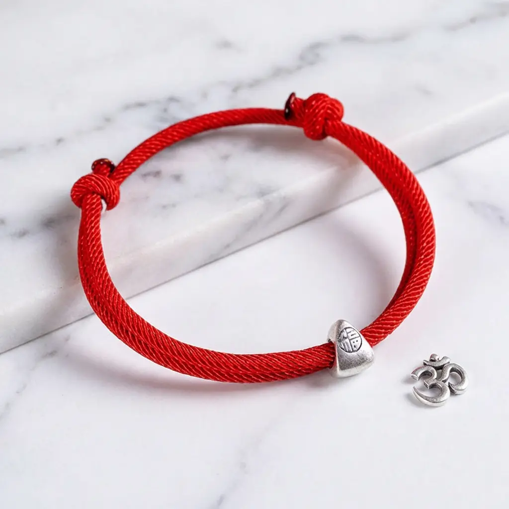 Adjustable red string Fu blessing bracelet with 925 silver charm on white marble surface next to Om symbol pendant