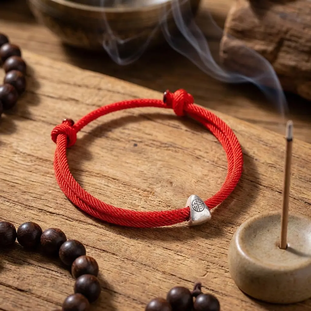 Handmade red string Fu bracelet on rustic wood table with prayer beads, incense holder and spiritual meditation items