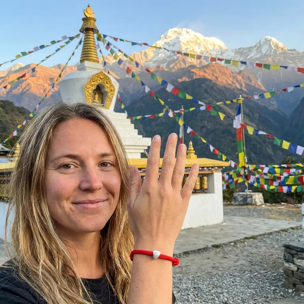 Traveler showing red string Fu lucky bracelet at authentic Tibetan Buddhist stupa with Himalayan mountains and prayer flags