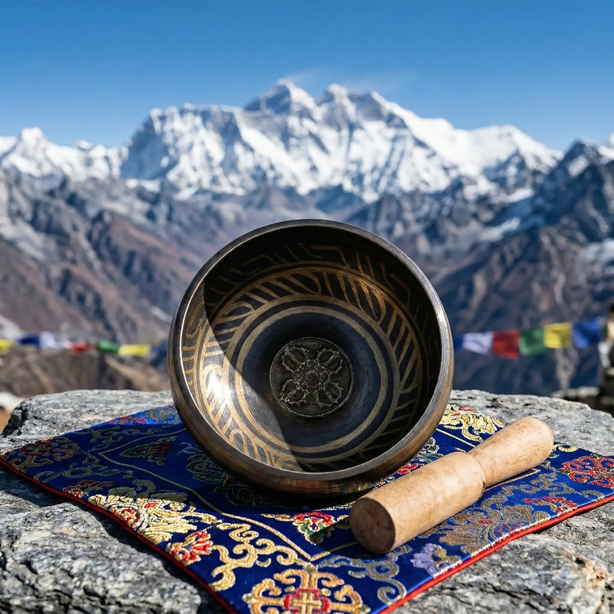 Handmade copper Tibetan singing bowl with wooden mallet resting on Himalayan embroidered cloth, snow-capped peaks and prayer flags in background