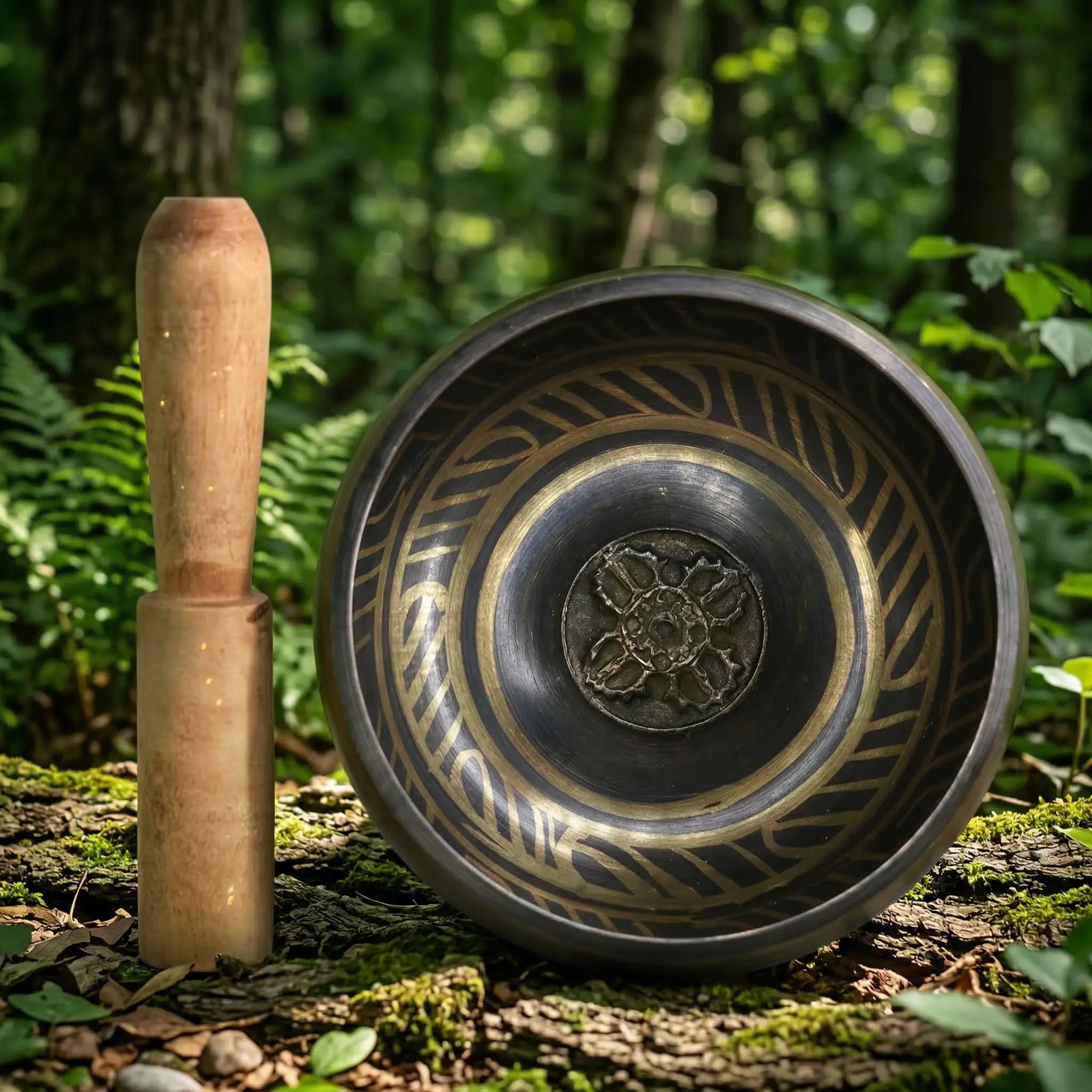 Tibetan copper singing bowl with engraved wave pattern and raised lotus mandala center, standing with wooden mallet on mossy forest floor surrounded by green foliage
