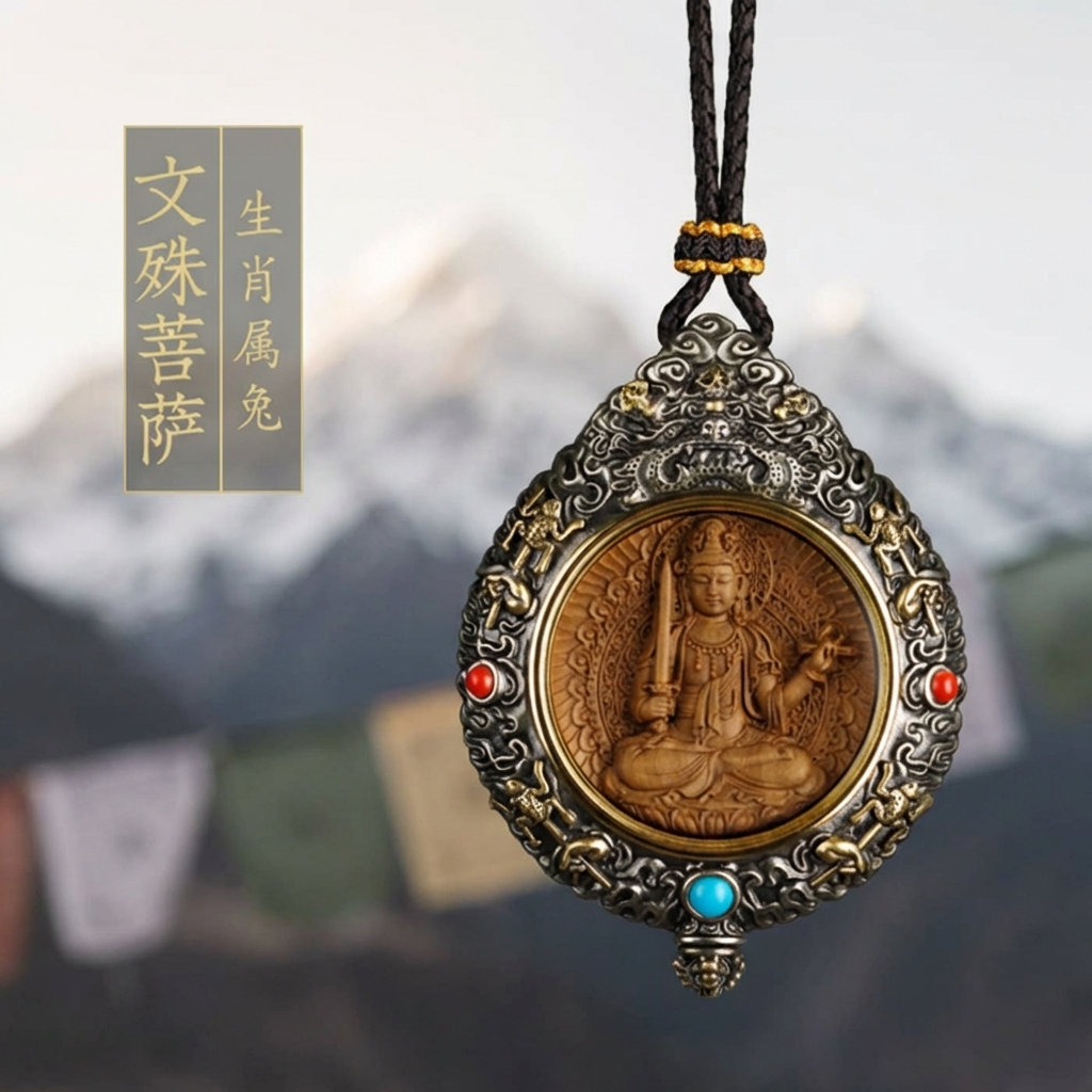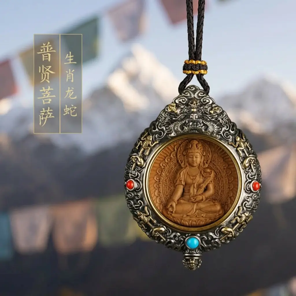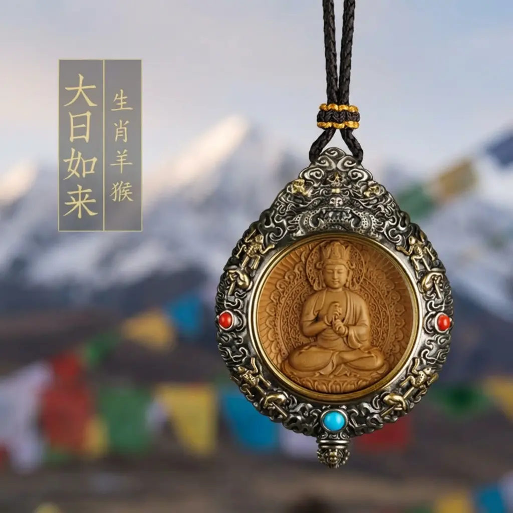 This hand-carved Tibetan pendant from PotalaStore carries that ancient bond into something you wear every day. Each piece features a natural sandalwood deity relief set within an ornate white brass and Tibetan silver frame, inlaid with turquoise and red coral accents. At 48mm × 64mm, it’s substantial without being heavy — a presence you feel, not just see.